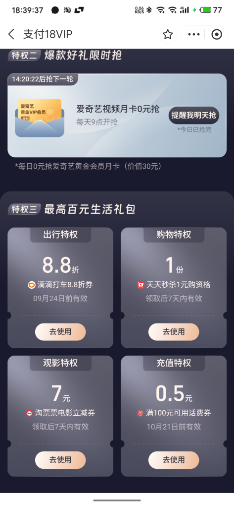 如果不想每天使用支付宝支付解锁支付18VIP进度,可以直接支付18元开通,不过狗哥不懂这样做有什么意义。就图三甲医院问诊和那个需要抢的爱奇艺会员吗?