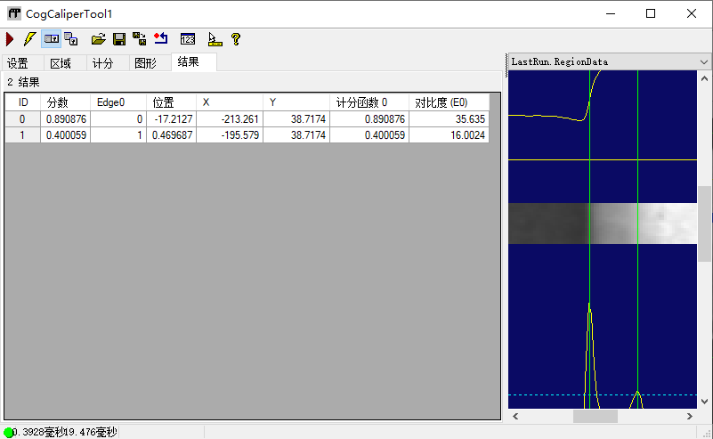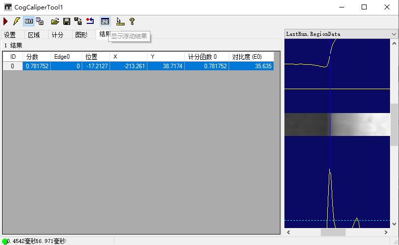 对比度函数我的理解是,图像上像素的明暗变化值差异,将搜索宽度上的每个像素差异平均后,延搜索方向计算下去,生成一个与搜索长度相等的波形图,也就是在LastRun.RegionData