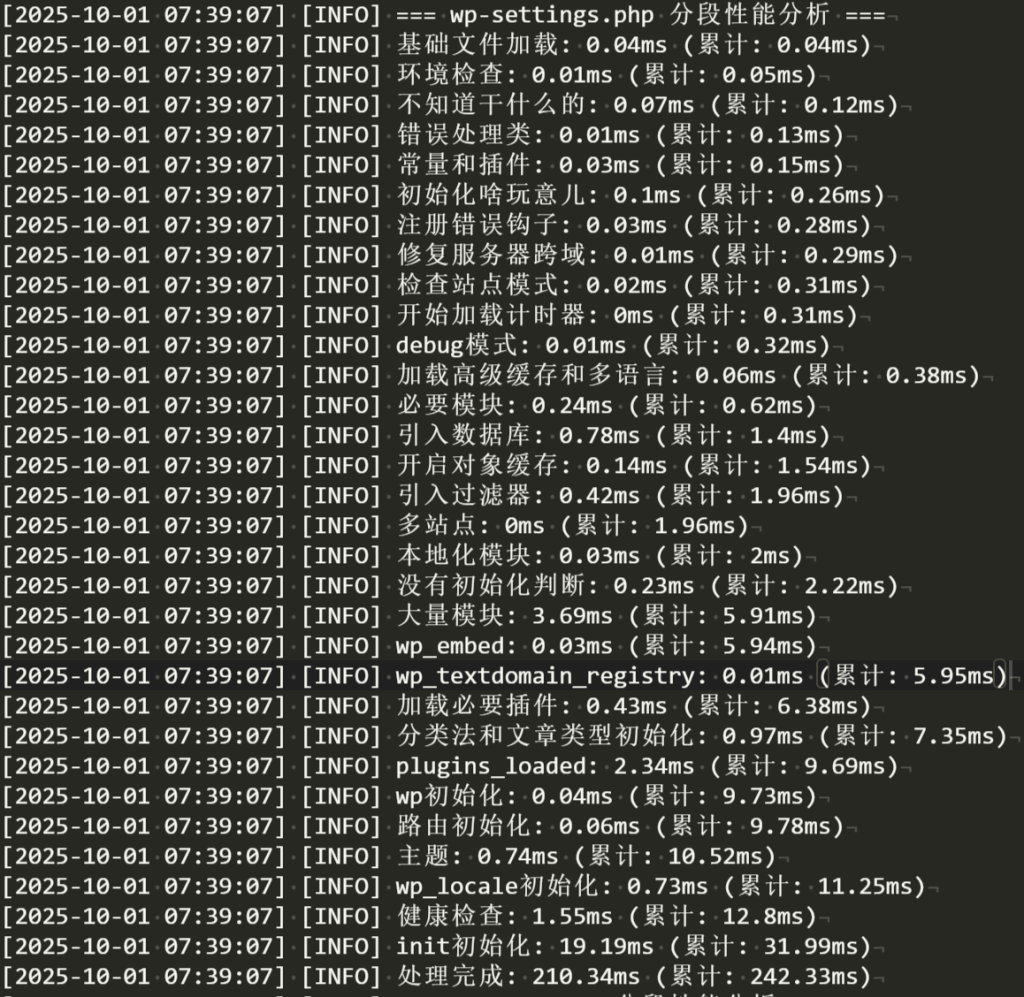 wp_debug_log("=== wp-settings.php 分段性能分析 ===");