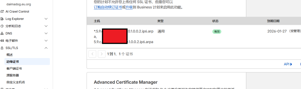 然后点击添加证书,提示成功后,到Cloudflare的对应域名,左侧菜单SSL边缘证书中可以看到如下所示证书。