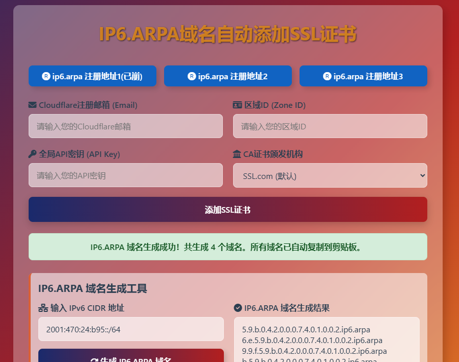 ip6.arpa地址转换项目https://gist.github.com/eooce/d3549e80a67dd39e47a55f81bae6b802,嫌部署麻烦的,可以直接使用作者部署的https://ipv6.jiemi360.workers.dev/