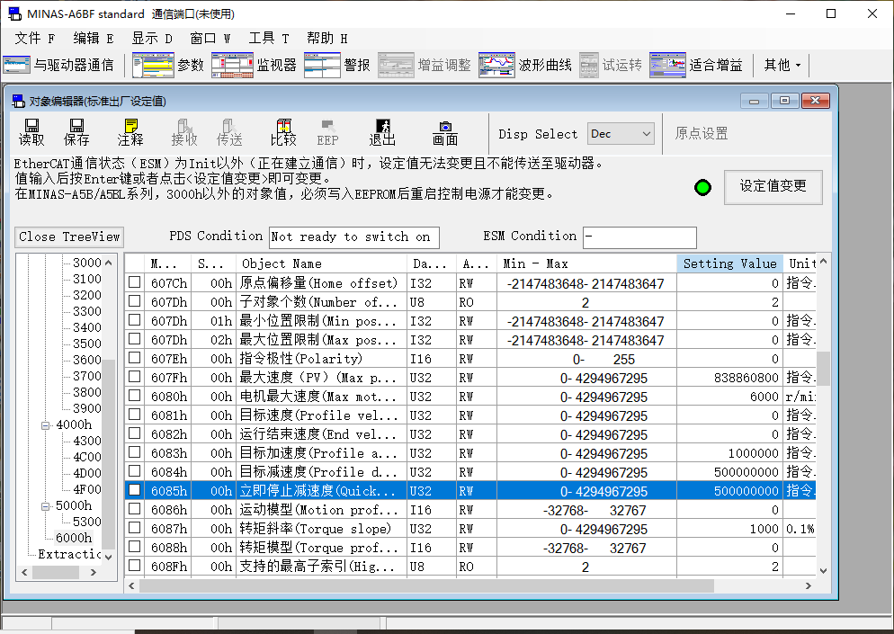 松下伺服驱动器出现碰到限位传感器后,轴不能立即停止,表现为碰到限位传感器后,仍然运动,或减速运动,或报警掉使能等。解决办法是将对象编辑器中6084H与6085H两个值放大。