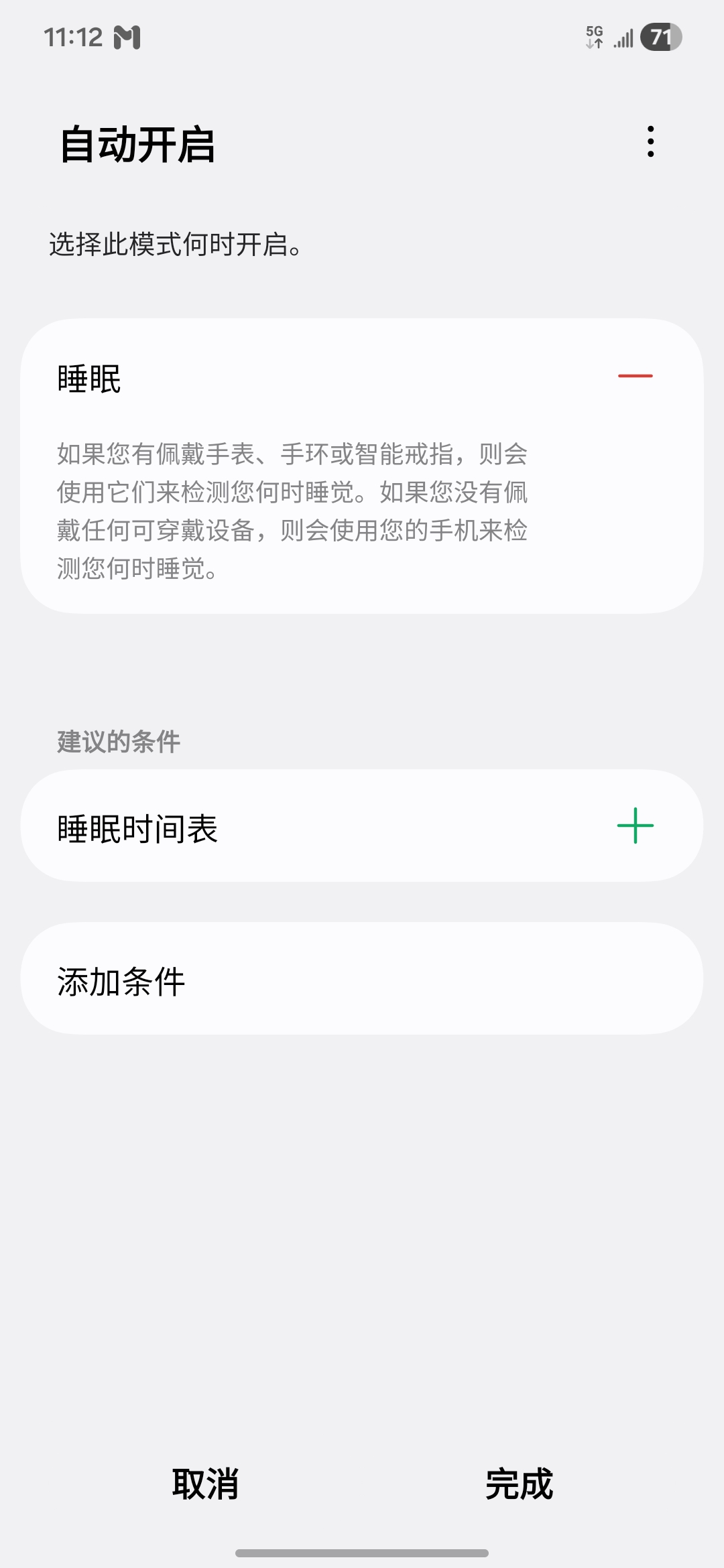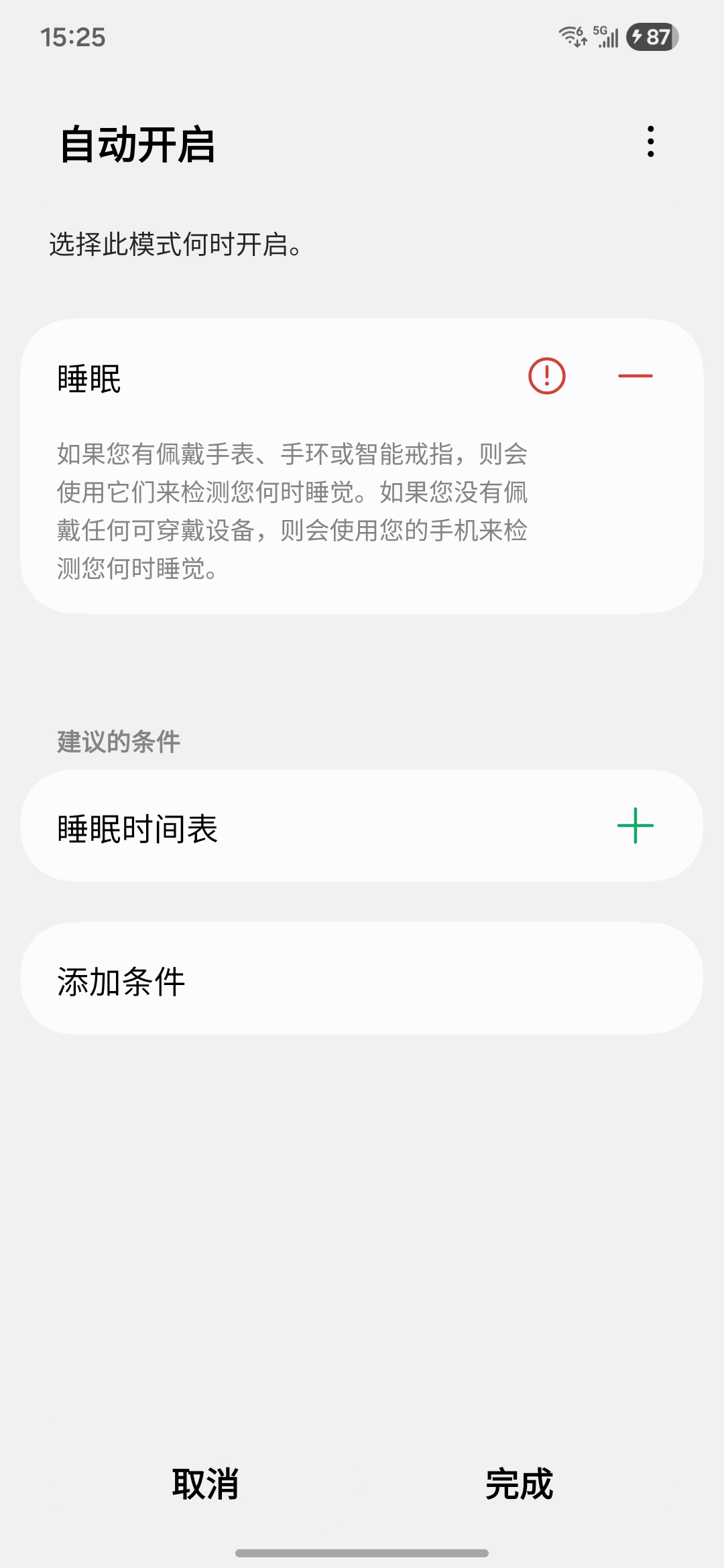 二是使用自动检测睡眠状态,可以使用穿戴设备如手表、手环、智能戒指等设备检测你的睡眠状态,当然没有这些穿戴设备也是可以正常使用自动检测功能的,因为你的手机也是智能设备,不玩儿手机了,就是要睡觉了,不过没有穿戴设备检测准而已。