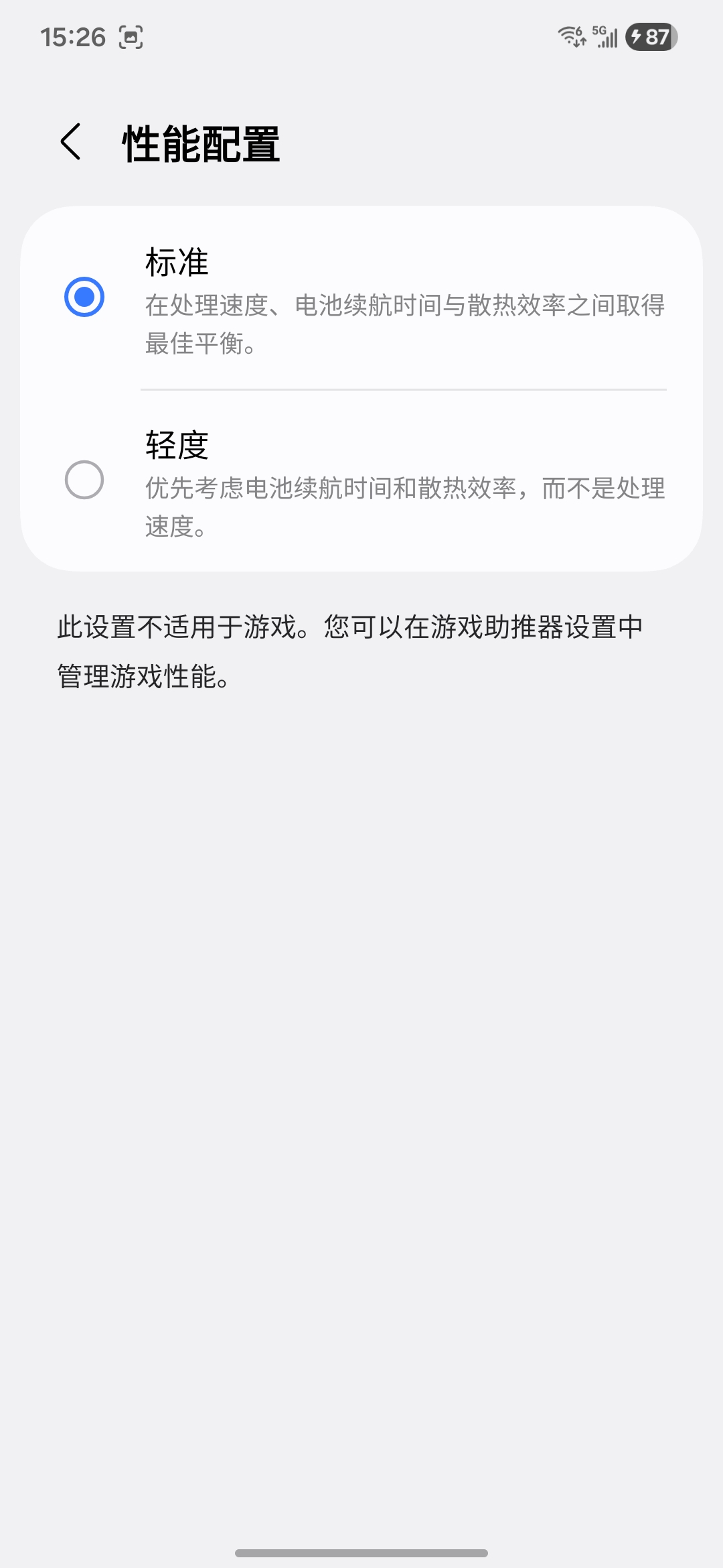 原因是因为性能模式设置为了轻度,只需要在设置——智能管理器——设置 中,将性能配置改为标准即可。