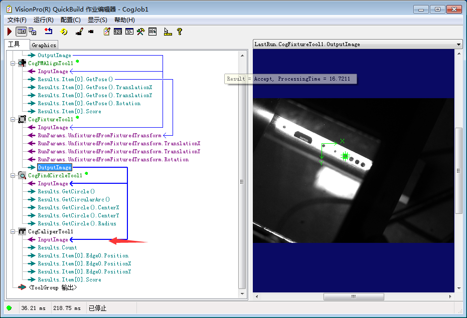 今天讲第二个常用工具,卡尺Caliper。依旧打开昨天的工程,并在工具箱中拖拽一个CogCaliperTool工具到流程的最后。如下图: