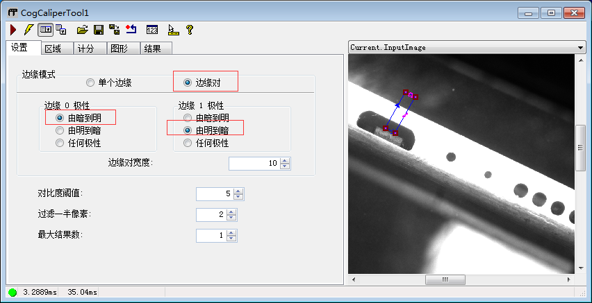 第二步,双击工具进入编辑。将单个边缘改为边缘对,并将卡尺大小方向调整好,极性是指按照卡尺实心箭头所指方向,明暗变化。