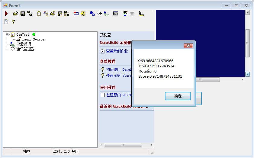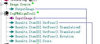 private void button1_Click(object sender, EventArgs e) { mymanger = (CogJobManager)CogSerializer.LoadObjectFromFile(path);//加载路径中的vpp文件 cogJobManagerEdit1.Subject = mymanger;//将加载进来的vpp文件对象赋值给jobmanger控件 mymanger.Job(0).Stopped += new CogJob.CogJobStoppedEventHandler(jobstoped);//注册停止事件 } public void jobstoped(object obj,CogJobActionEventArgs arg) { CogJob job0 = (CogJob)obj; CogToolGroup ctg = (CogToolGroup)job0.VisionTool; CogPMAlignTool cra = (CogPMAlignTool)ctg.Tools["CogPMAlignTool1"]; double X = cra.Results[0].GetPose().TranslationX; double Y = cra.Results[0].GetPose().TranslationY; double Rotation = cra.Results[0].GetPose().Rotation; double Score = cra.Results[0].Score; MessageBox.Show("X:" + X + "\r\n Y:" + Y + "\r\n Rotation:" + Rotation + "\r\n Score:" + Score); } private void button2_Click(object sender, EventArgs e) { mymanger.Job(0).Run();//运行vpp }
