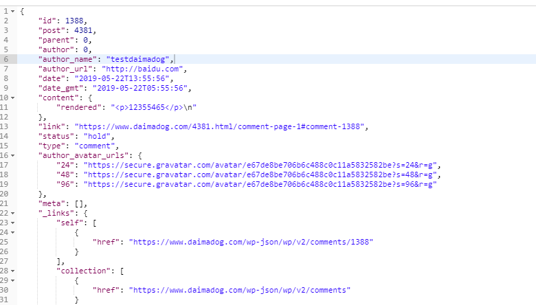 域名/wp-json/wp/v2/comments?post=4381&content=12355465&parent=0&author_name=testdaimadog&author_email=123435346@qq.com&author_url=http://baidu.com