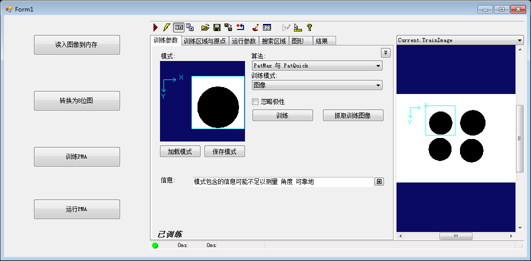 Bitmap img;//读入的普通图像 CogImage8Grey img_8;//用作处理的CogImage8Grey类型图像 CogPMAlignTool pma;//PMA工具全局变量 CogPMAlignPattern pmap;//PMA工具训练模板全局变量