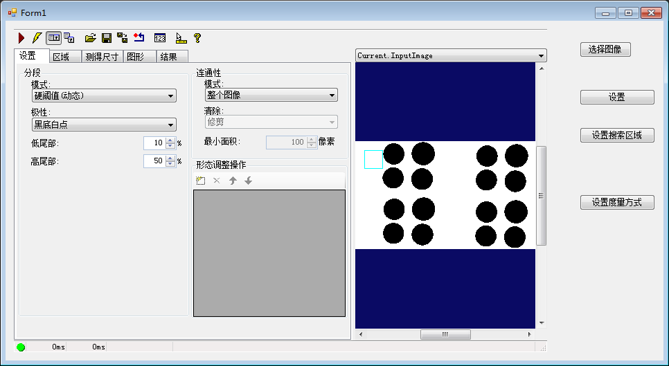 OpenFileDialog opf = new OpenFileDialog(); if(opf.ShowDialog()==DialogResult.OK){ img8 = new CogImage8Grey(new Bitmap(opf.FileName)); cbt = new CogBlobTool(); //绑定到控件,方便观看效果,可以删除 cogBlobEditV21.Subject = cbt; //设置输入图像 cbt.InputImage = img8; }