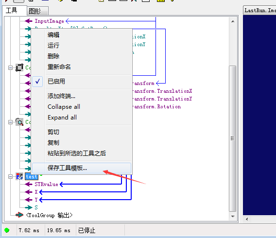 回到visionpro中,右键我们刚刚使用的工具组,重命名为自己喜欢的名字。右键保存模板,然后就可以在工具箱中看到了,下次使用直接拖出来就行了。