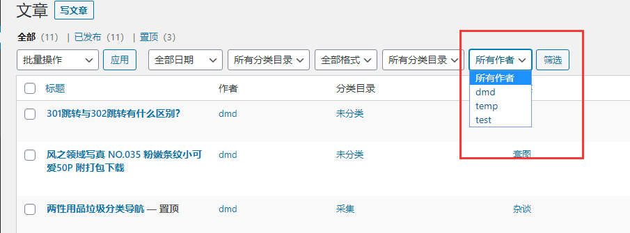 //WordPress代码实现后台文章列表添加作者筛选功能 //https://www.daimadog.com/6595.html add_action('restrict_manage_posts', 'author_select'); function author_select($post_type){ if(post_type_supports($post_type, 'author')){ wp_dropdown_users([ 'name' => 'author', 'who' => 'authors', 'show_option_all' => '所有作者', 'hide_if_only_one_author' => true, 'selected' => $_REQUEST['author'] ?? 0 ]); } }