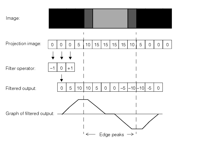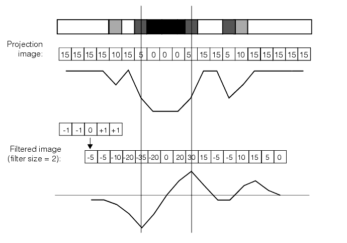 图中Filtered operator是卷积核,这个东西按照自己的需求条件,卷积核越大,滤波后的干扰越少。卷积算法是这样的,将卷积核与对应的每个位置的像素相乘再相加得到新的像素值。举个例子,上图最左侧开始滤波,第一个滤波结果计算为:(0*-1)+(0*0)+(0*+1)=0。