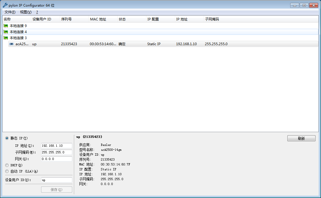 然后使用pylon IP Configurator程序配置相机信息,主要是修改ip,使相机与电脑在同一局域网下。