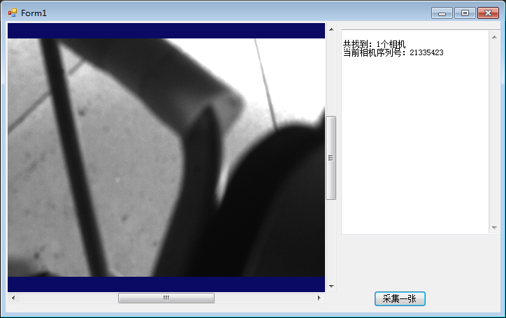 mCamera.StreamGrabber.Start(); IGrabResult grabResult = mCamera.StreamGrabber.RetrieveResult(5000, TimeoutHandling.ThrowException); if (grabResult.GrabSucceeded) { //将图像数据转换为位图 Bitmap bitmap = new Bitmap(grabResult.Width, grabResult.Height, PixelFormat.Format32bppRgb); BitmapData bmpData = bitmap.LockBits(new Rectangle(0, 0, bitmap.Width, bitmap.Height), ImageLockMode.ReadWrite, bitmap.PixelFormat); PixelDataConverter converter = new PixelDataConverter(); converter.OutputPixelFormat = PixelType.BGRA8packed; IntPtr ptrBmp = bmpData.Scan0; converter.Convert(ptrBmp, bmpData.Stride * bitmap.Height, grabResult); bitmap.UnlockBits(bmpData); //使用visionpro显示控件显示出来 cogRecordDisplay1.Image = new CogImage8Grey(bitmap); } else { Console.WriteLine("Error: {0} {1}", grabResult.ErrorCode, grabResult.ErrorDescription); } mCamera.StreamGrabber.Stop();