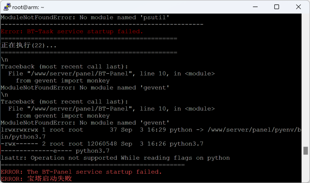 根据错误提示,是缺少模块,你可以手动安装,但是不一定你安装的版本能兼容宝塔程序员写的代码,所以,建议执行如下命令,安装下面的模块。